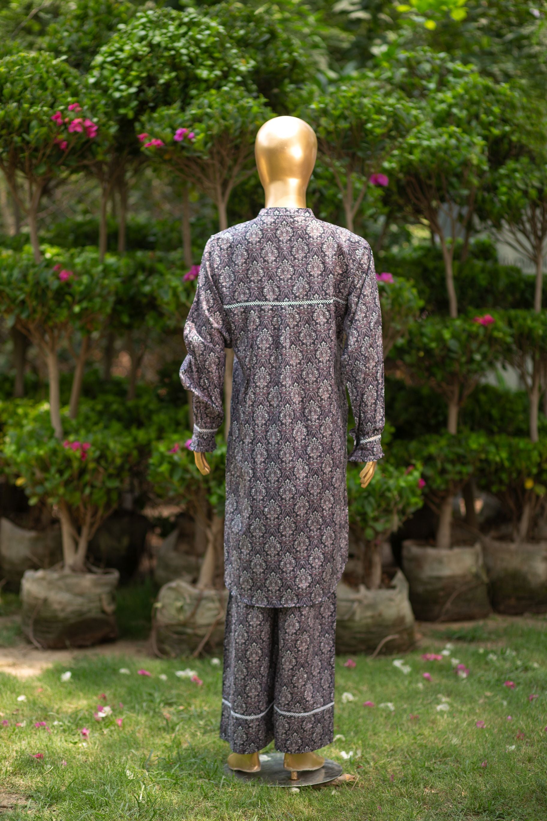 The Black Crown reveals its elegance in the form of a button-down tunic with a eyelet-lace ruffled collar and cuffs. Paired with trousers in the same print to offer you a complete sophisticated look.