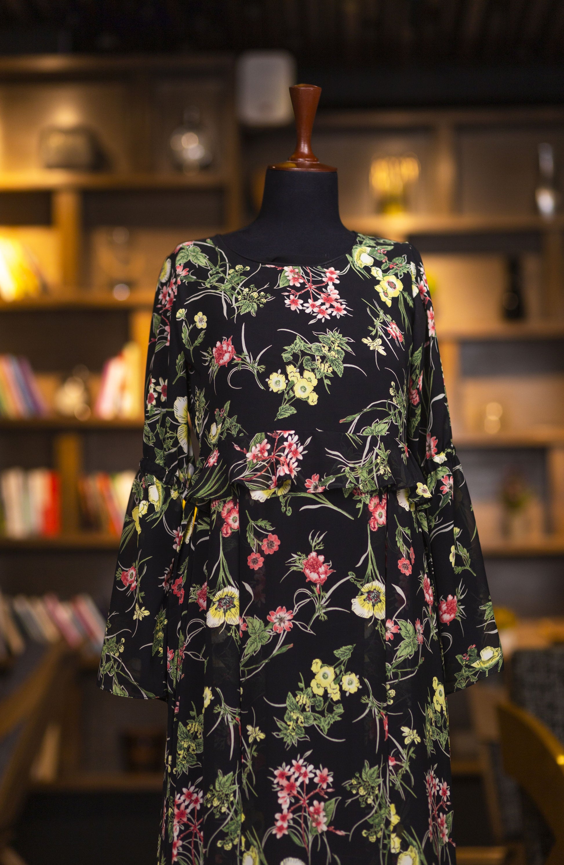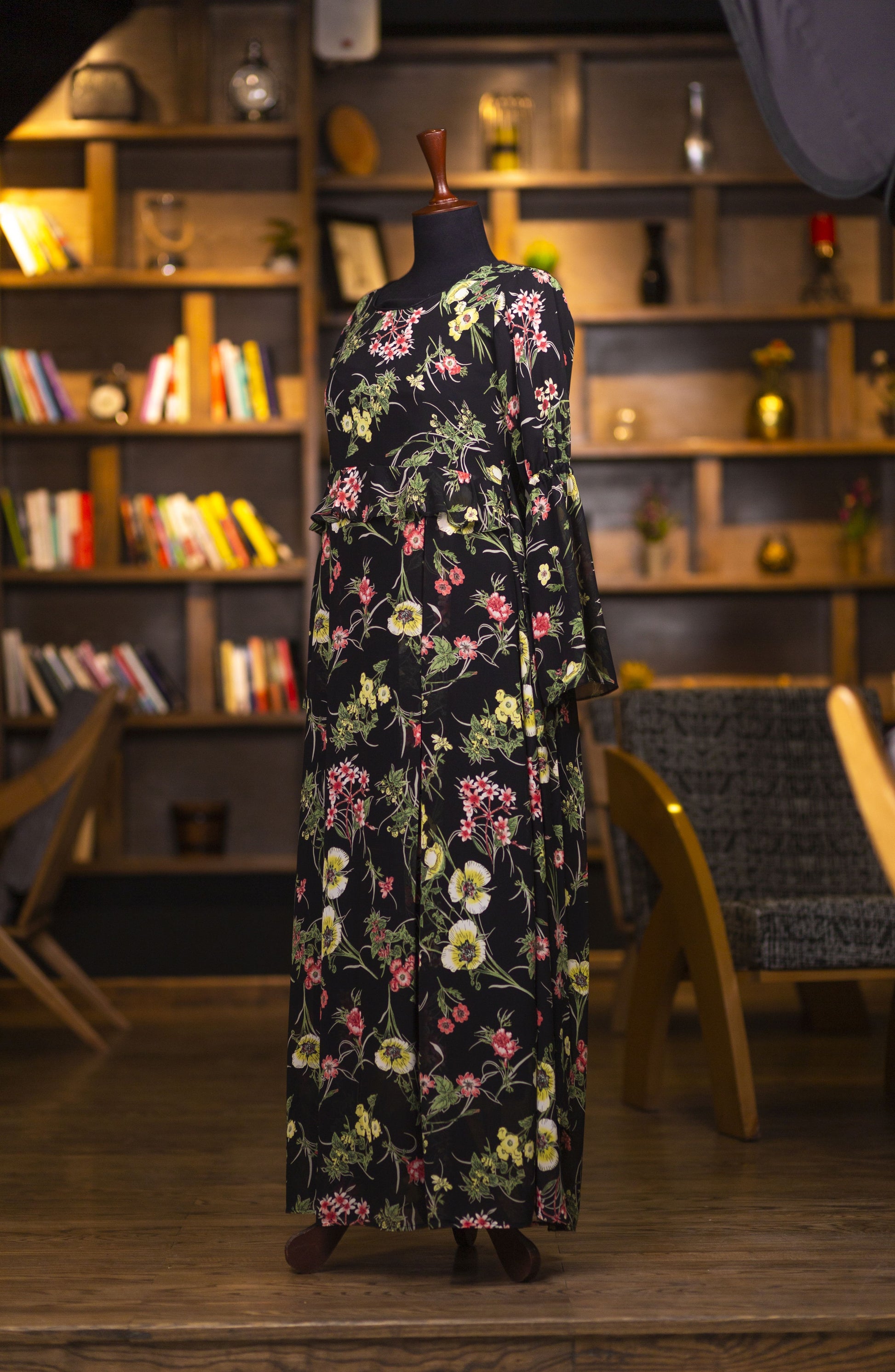 Show your style with black floral maxi with round neckline and flounce waist. Full-length frill sleeve at elbow. Straight hemline.