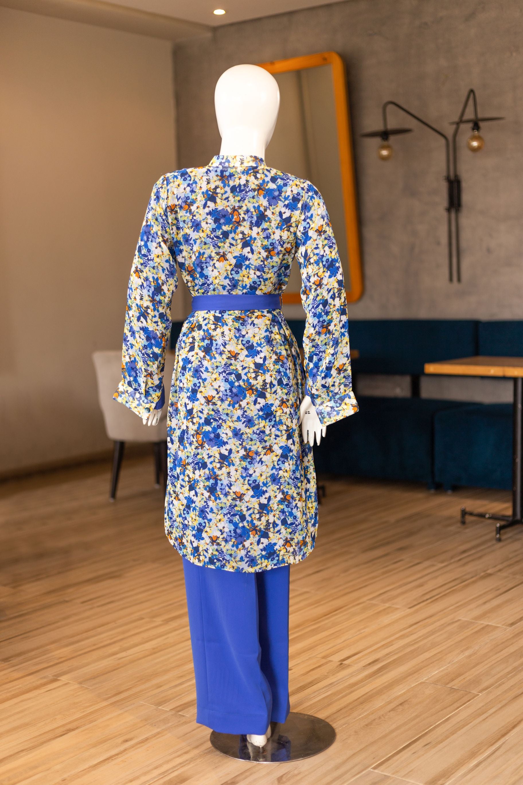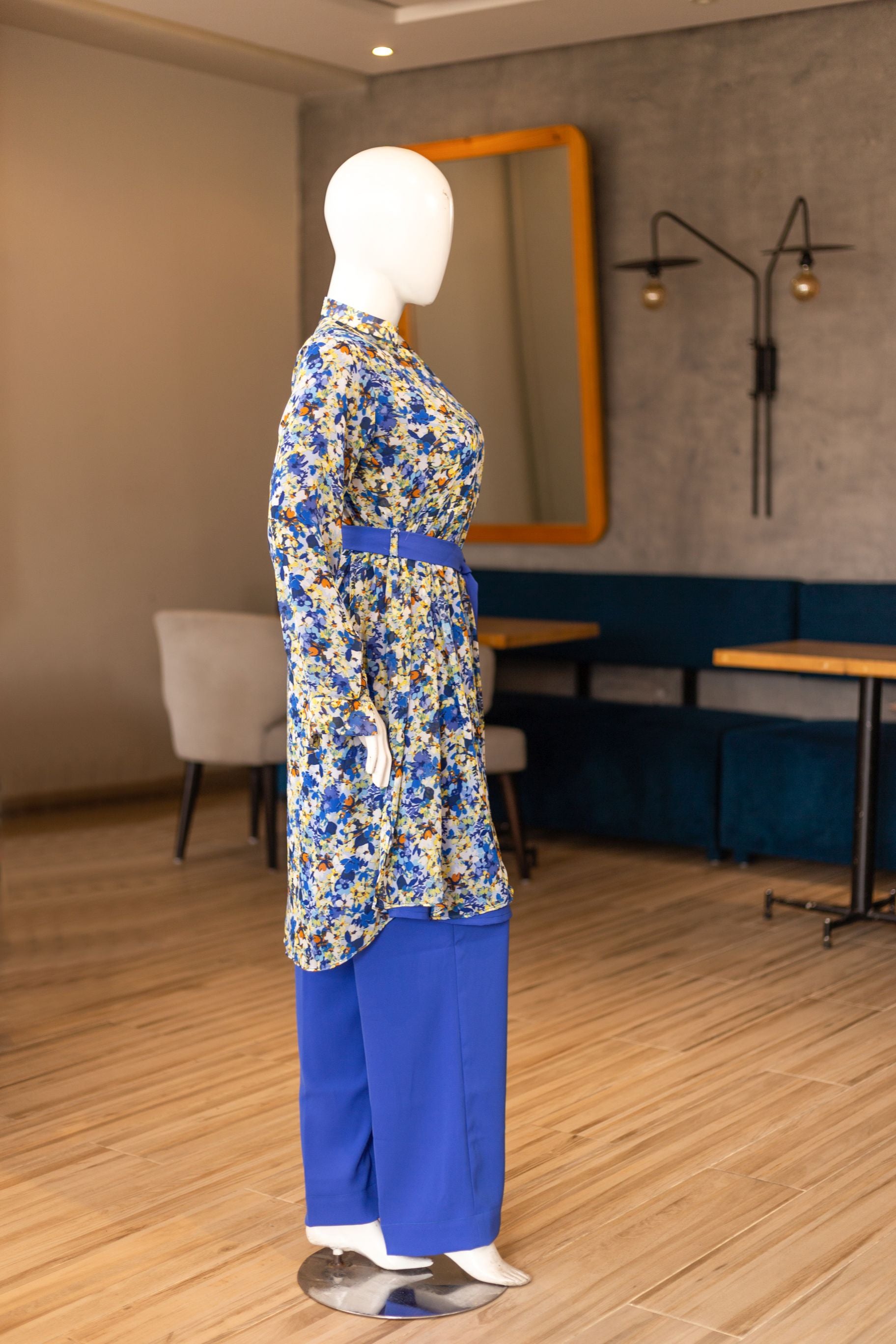 Jazz it up with our 3 Piece tunic suit. Front open printed tunic. Band collar, belted waistline, open front button closure, loose fit cuffed sleeves with button closure, and slightly curved hemline. Tunic: round neckline, tapered sleeve, straight hemline. Straight cut loose fitted trousers. Our 2piece tunic pantsuit can be bought separately.