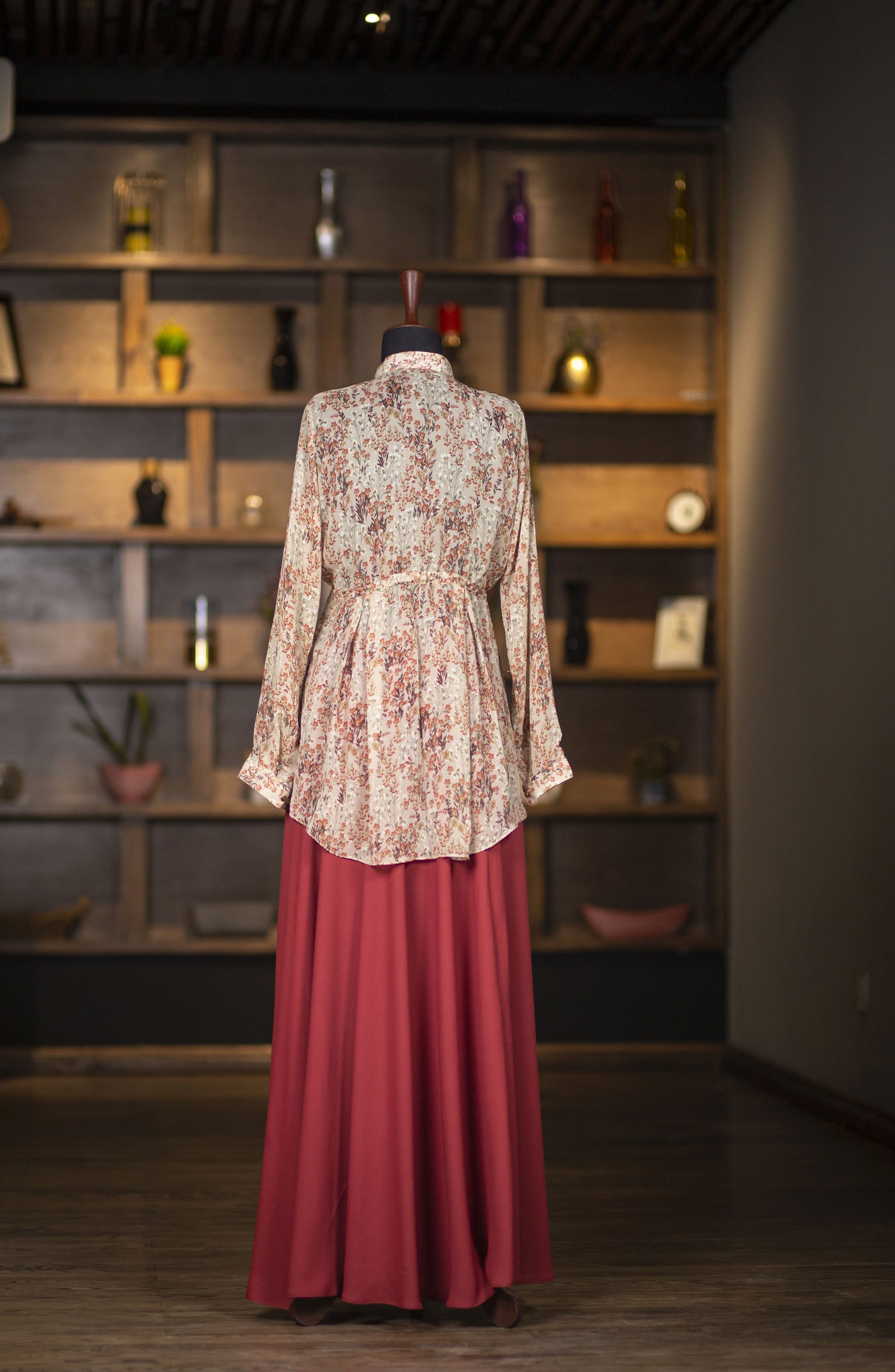 Express yourself with our rust and tan floral 2-piece skirt and blouse suit. Band collar with open front button closure, cuffed sleeves, drawstring waist and round hemline. Full round circle skirt.