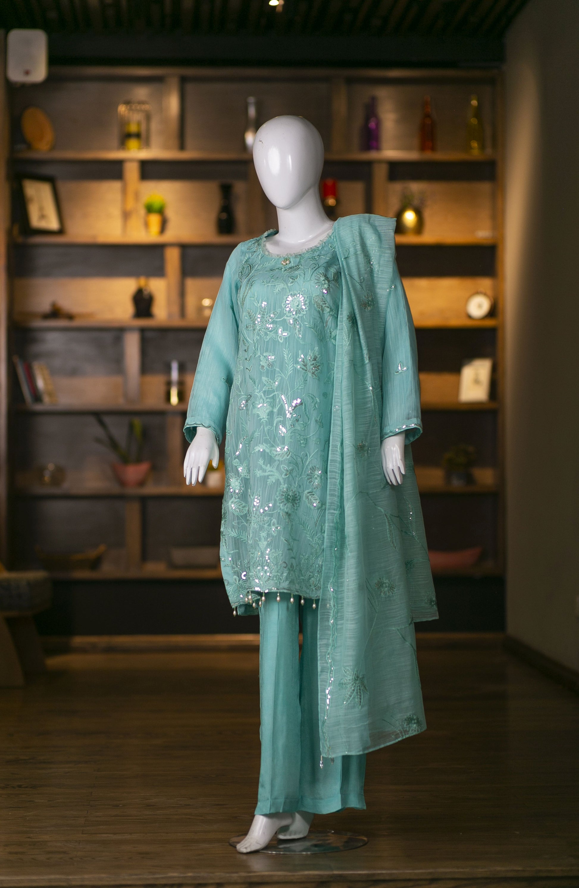 Express yourself with aqua breeze 3 piece suit. Kurti with straight trousers and dupatta. Embroidered, embellished blouse with round neckline and straight sleeve. Scallop hemline with crystal bead embellishment.